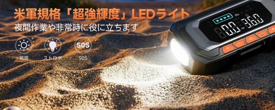 逆接続、過熱、短絡、過充電など10種類の保護機能を搭載した「全方位安全防護システム」を採用。誤操作による事故を未然に防ぎます。また、米軍規格に準じた超高輝度LEDライト(照明/ストロボ/SOSの3モード)を内蔵し、夜間のトラブル時も強力にサポートします。