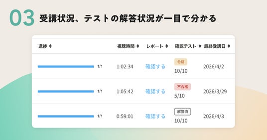 また、受講者は解答後に参考チャプターへの導線から復習でき、人事担当者は受講状況やテスト結果を一覧で確認することで、個人ごとの理解度把握やその後のフォローに活用できます。