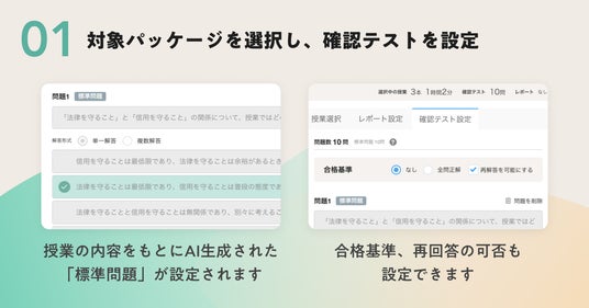 人事担当者は研修パッケージごとに確認テストを設定でき、受講者は研修受講後に自動でテストへ解答できます。テスト問題は、授業内容をもとにAIが標準問題として自動生成しています。あわせて、合格基準や再解答の可否も設定可能です。