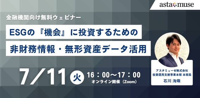 アスタミューゼ株式会社(本社:東京都千代田区、代表取締役社長 永井歩)は、2023年7月11日(火)16:00~17:00に、金融機関の方々を対象とした無料ウェビナー「ESGの『機会』に投資するための非財務情報・無形資産データ活用」を開催いたします。