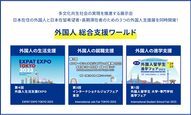 さらに外国人留学生のための進学フェアを同時開催展として新設、総称:外国人総合支援ワールドとして、日本在住の外国人向けに、より一層幅広い支援を行ってまいります。