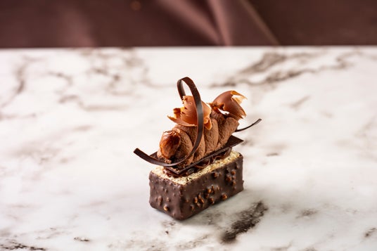 何層にも重なる味わいの上には、パティシエが厚さにこだわり削ったチョコレートが優しいくちどけを演出。
