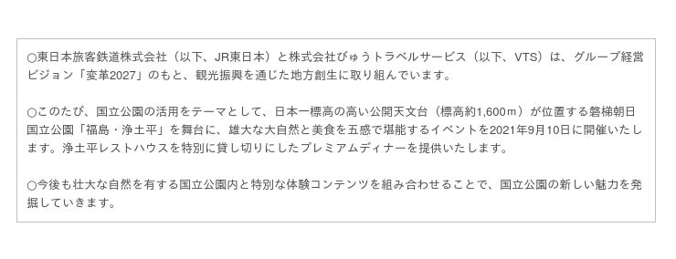 ○JR東日本グループは地域との連携と自然環境保全への配慮をしながら、国立公園の美しい景観とその周辺等での滞在といった魅力を引き出すことで、観光需要創出を通じた地方創生に取り組みます。
