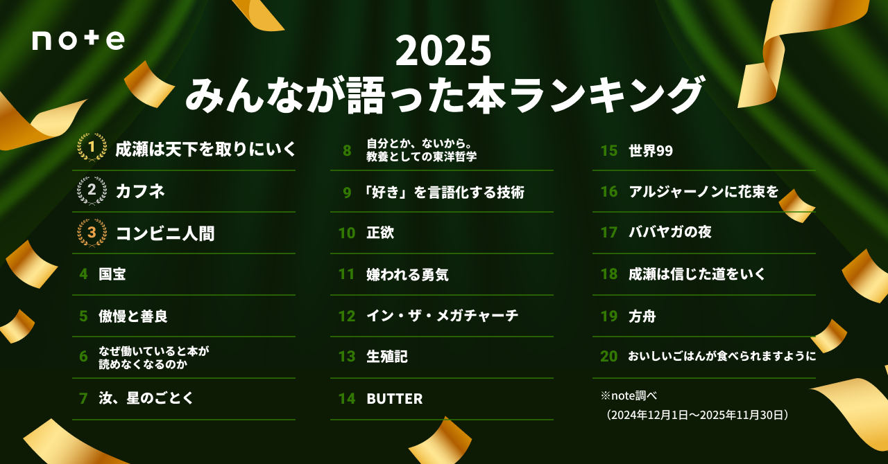 2025年にもっとも多くnoteで語られた本は、2024年に続き、シリーズ累計190万部を突破した宮島未奈さんの青春小説『成瀬は天下を取りにいく』が連覇しました。今年から発表項目に追加した、集計期間中に刊行された新作を対象とした「新着作品ランキング」では、朝井リョウさんがファンダム経済を描いた『イン・ザ・メガチャーチ』が1位を獲得しました。