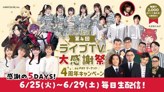 株式会社エブリー(本社:東京都港区、代表取締役社長:吉田 大成)が運営する『TIMELINE』は、auコマース&ライフ株式会社(本社:東京都渋谷区、代表取締役社長:桑田 祐二)が運営する総合ショッピングサイト『au PAY マーケット』アプリ内のライブコマースサービス「ライブTV」において、2024年6月25日から29日の5日間、「第4回ライブTV大感謝祭(以下、本番組)」を放送します。