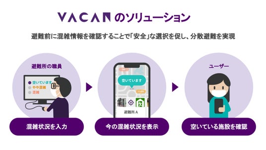地震、風水害その他の災害時等において、避難施設に係る情報(開設・混雑状況)をバカンが提供するリアルタイム空き情報配信プラットフォーム「VACAN」を通じて行うことで、利用者はインターネット上での確認が可能です。