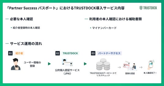 株式会社TRUSTDOCK(東京都中央区、代表取締役:千葉 孝浩)は、パートナーサクセス株式会社(東京都港区、代表取締役:永田 雅裕)が展開する、いますぐ だれでも 売れる代理店になれる 紹介マーケット「PartnerSuccess パスポート」に、eKYCサービス「TRUSTDOCK」の提供を開始いたしました。