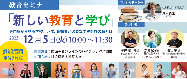 社会人向け総合専門職大学院の社会構想大学院大学(東京都新宿区、学長:吉國浩二)は、教育の専門家から見る、現代の教育事情から「新しい教育と学び」をメインテーマに教育セミナーを対面、オンラインのハイフレックス形式で12月5日(火)開催します。