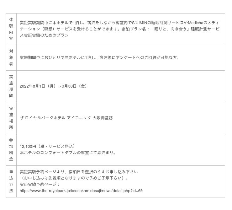 株式会社ロイヤルパークホテルズアンドリゾーツ(代表取締役 水村(みずむら) 慎也(しんや)、以下 RPHS)と株式会社S’UIMIN(代表取締役 藤原(ふじわら) 正明(まさあき)、以下 S’UIMIN)と、Medicha株式会社(代表取締役 長嶋(ながしま) 彩(あや)加(か)、山脇(やまわき) 一恵(かずえ)、以下 Medicha)、一般社団法人関西イノベーションセンター(代表理事 林(はやし) 安秀(やすひで)、以下 当社団)は、RPHSが運営するザ ロイヤルパークホテル アイコニック 大阪御堂筋(以下 本ホテル)において、睡眠に関するサービス提供に向けた実証実験を実施することになりました。つきましては、本ホテルに宿泊しながらサービスを体験できる実証実験参加者を募集いたします。なお、この取り組みは、当社団が運営するイノベーション創出拠点「MUIC Kansai(以下 MUIC)」の課題解決プログラムにて実施する実証実験となります。