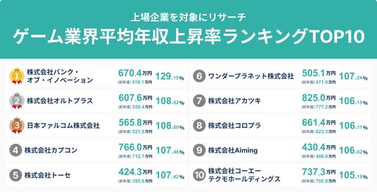 ゲーム業界平均年収上昇率ランキングTOP10について