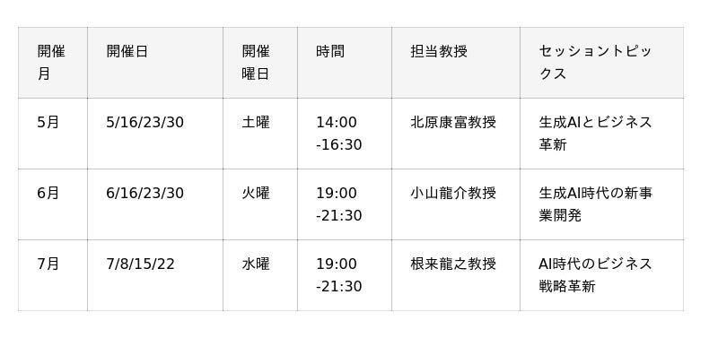 本年度春学期は、「AI for Business Leaders」をテーマとして、下記のように開講します。AI時代のマネジメント層に求められるスキル(Skill)・知識(Knowledge)・姿勢(Attitude)を体系的に習得できるプログラムとして、本学の人気教授3名が講義を担当します。また、本講座は、3つのセッションで構成され、2つ以上のセッションに参加し、各セッションの出席率が75%以上(各セッション2回以上出席)の方には、修了証(Certificate)を発行します。修了証は、参加者の専門知識およびスキルの習得を証明するものです。