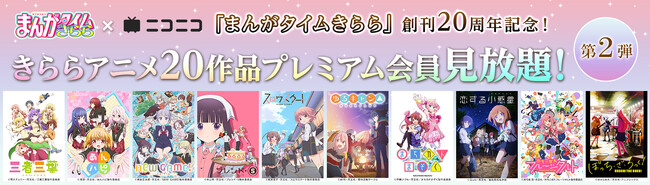 株式会社ドワンゴは、動画コミュニティサービス「ニコニコ動画」にて、2024年1月4日(木)より、「まんがタイムきらら」が創刊20周年記念第2弾として、先日発表した第1弾に引き続きニコニコプレミアム会員向けに見放題で「まんがタイムきらら」が輩出したアニメ作品10作品の配信を開始します。第1弾の作品と合わせて、合計20作品がニコニコプレミアム会員見放題となります。