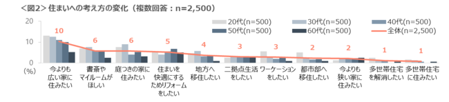 コロナ禍の住まいに対し、「今よりも広い家に住みたい」「書籍やマイルームがほしい」「庭つきの家に住みたい」との声があがった。20~30代は「今よりも広い家に住みたい」「庭つきの家に住みたい」が他世代より高い結果である。<図2>