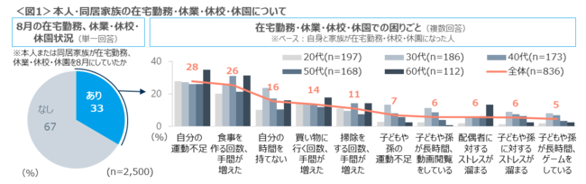 オミクロン株の感染者数の増加により、8月に本人や同居家族の在宅勤務、休業・休校・休園があった世帯は33%にのぼる。本人や家族が家にいることで、「自分の運動不足」「食事を作る回数、手間が増えた」「自分の時間を持てない」「買い物に行く回数・手間が増えた」などが困った点としてあげられた。60代は「自分の運動不足」「食事を作る回数、手間が増えた」「配偶者へ対するストレスが溜まる」において、突出して高い。<図1>