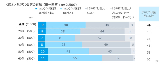 第7波では発熱外来の予約が困難な状況となり、まずは、かかりつけ医へ相談と受診の依頼があったことを鑑み、かかりつけ医の有無を確認した。半数は、かかりつけ医がいるとの回答であり、最も高い60代で66%、最も低い30代は38%であった。そもそも「かかりつけ医がわからない・知らない」人が、20~30代は1割ほど存在している状況であった。<図3>