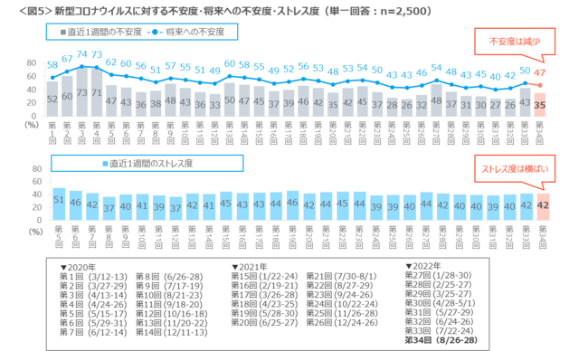 定点指標の「直近1週間の不安度」は8p減の35%、「将来に対する不安度」は3p減の47%と不安度は減少した。「直近1週間のストレス度」は、先月と同様の42%である。<図5>