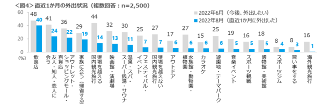 感染者数が落ち着いた6月末に聴取した”今後、外出したい”ところと、この夏”直近1か月間に外出した”ところを比較した。 実際に行った先は「飲食店」が最も多く40%、次いで「友人・知人・恋人に会う」「アウトレット・ショッピングモール・百貨店」。「県境を越える国内観光旅行」は、意向が44%に対し、行った人は14%と最も開きが大きかった。行動制限のない夏ではあったものの、近場で行楽をすませている人が多かったと推察される。<図4>