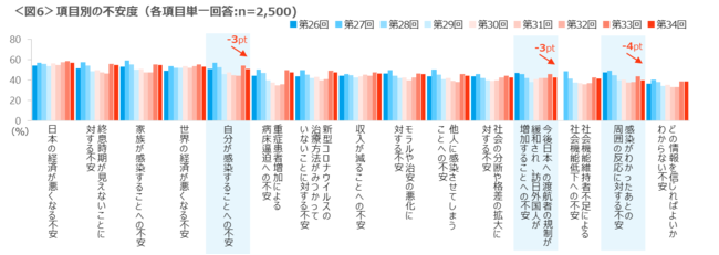 項目別の不安度は全項目において微減。その中でも「感染が分かった後の周囲の反応に対する不安」は4p減少した。<図6>