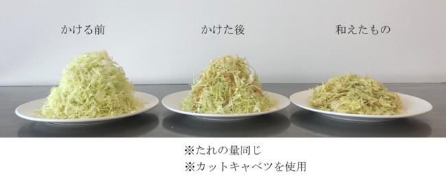 また、チョレギ本来の食べ方である「和えること」で更なる満足度を高めます。たれを「かける場合」「和える場合」で検証したところ、野菜のかさに大きな差が出ることがわかりました(写真)。写真からもわかるように、たくさんの野菜も「和える」ことで味がまんべんなくからむだけでなく、同時に野菜のかさも減るので、無理なく野菜を摂取できるというメリットがあります。