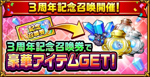 6月1日(金)~7月23日(月)の期間中、ログインボーナスで入手した「3周年記念召喚券」を使用して、ソウルベリーなどの豪華アイテムをGET!クリスタルも最大で100個当たるチャンス!