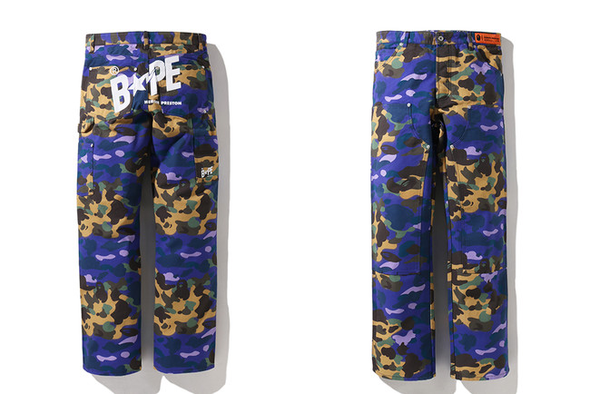 ワークウェアジャケットとユーティリティパンツは、両ブランドの二元性を反映させています。ヘロン・プレストンはワークウェアを破壊的に解釈し、BAPE(R)のワークウェアとパンツのセットアップに「Ape Shall Never Kill Ape」といったスローバックなジェスチャーをプリントし、ブランドのアイコンでもある黄色の1st CAMOとカラフルなパープルのCOLOR CAMOを、独特のツートーンで演出しています。ヘロン・プレストンは自身のブランドのDNAとBAPE(R)を融合させ、新しくユニークなものを提案しました。