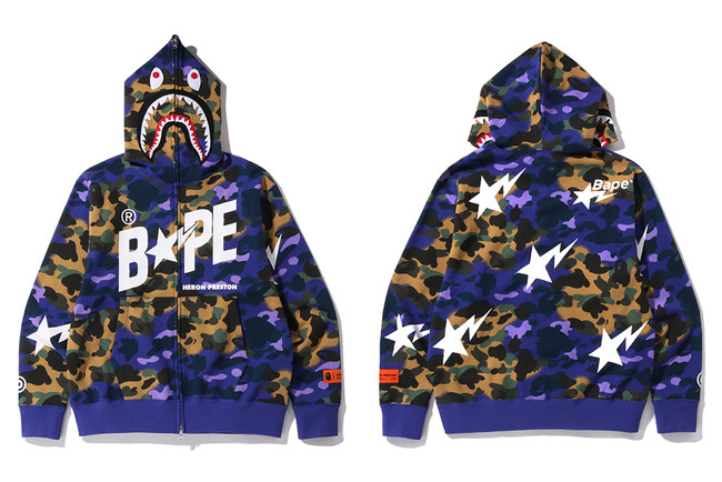 ヘロンはA BATHING APE(R)︎(以下BAPE(R))のアーカイブを深く掘り下げ、SHARK HOODIE、BAPE(R) CAMO、APE HEAD、BAPE STA™️といった、時代の流れに乗った時に世代にインスピレーションを与えたカルト的な名作を再解釈しました。「instant language」*とヘロンが呼ぶデザインの原則を取り入れ、それぞれのアイテムの伝統と歴史を守りながら、そこに彼らしい言語を少しだけ加えています。(ヘロンの「instant language」は拾ったもの、原型、ユニフォームの3つを基盤としています。これらの要素をデザインに取り入れることで、目に入った瞬間私たちのシナプスを刺激すると同時に、好奇心を誘発するような異端的なデザインを作ることを目指しています。)