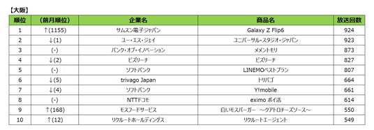 今回のランキングの傾向として、3位のソフトバンク「LINEMOベストプラン」、4位のサムスン電子ジャパン「Galaxy Z Flip6」、5位のソフトバンク「Y!mobile」、6位のNTTドコモ「eximo ポイ活」など、スマートフォン端末や料金プランなどのCMが上位にランクイン、携帯キャリア各社の新プラン・サービスやキャンペーンに関連したCMを中心に多く放映されました。