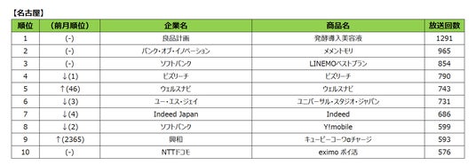 携帯キャリア各社のCMが増加、求人系サービスも前月に引き続きランクイン