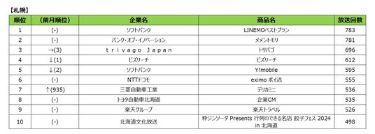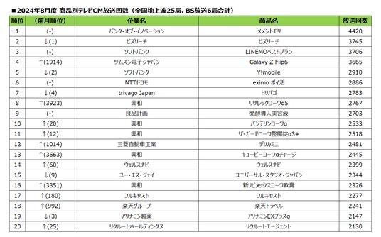 SMN株式会社(本社:東京都品川区、代表取締役社長:原山 直樹、以下SMN)は、2024年8月度の全国地上波25局、BS放送6局にて放送されたテレビCMの放送回数を調査し、集計しましたので、お知らせいたします。