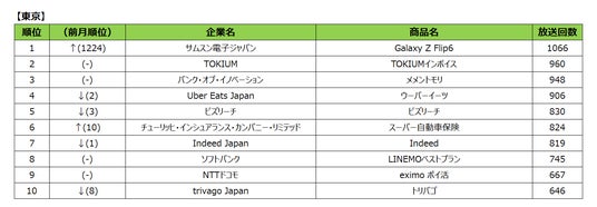 東京地区では商品別ランキングでランキング圏外だったTOKIUM「TOKIUMインボイス」が2位、Uber Eats Japan「ウーバーイーツ」が4位、Indeed Japan「Indeed」が7位にランクインしました。