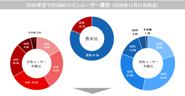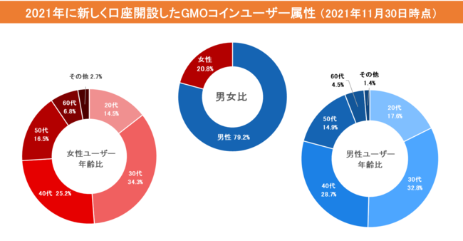 2021年に新しく口座開設をしたGMOコインユーザーを、2020年までに口座開設しているGMOコインユーザー属性と比較をすると、女性ユーザーの比率が「18.7%」から「20.8%」へ上昇。特にその中でも30代の新規口座開設比率が大幅高くなりました。