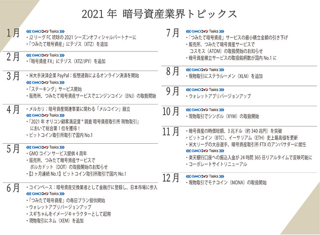 その結果、2021年4月、5月、11月の取引所取引におけるビットコイン出来高(差金決済/先物取引を含む)が、国内No.1となるなどより多くのお客様に当社サービスをご利用いただき、また、2021年4月1日に発表された「2021年 オリコン顧客満足度(R)調査 暗号資産取引所 現物取引」において、総合第1位を獲得するなど、当社の取り組みが評価された1年となりました。
