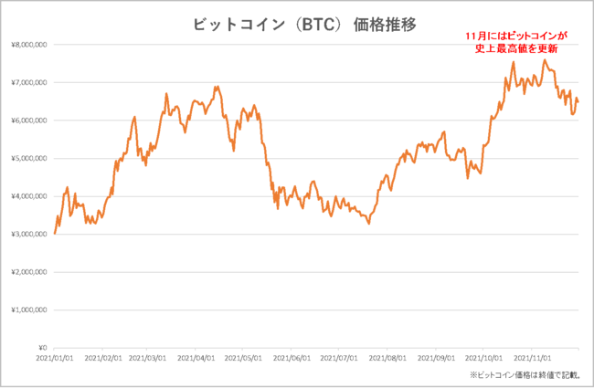 2021年のビットコイン価格の推移としましては、4月中旬まで順調に推移し、一時700万円まで上昇しました。その後は軟調な相場となり7月に掛けて300万円程度まで再び下落しましたが、再び上昇基調となり、11月には700万円を超え史上最高値を更新しました。