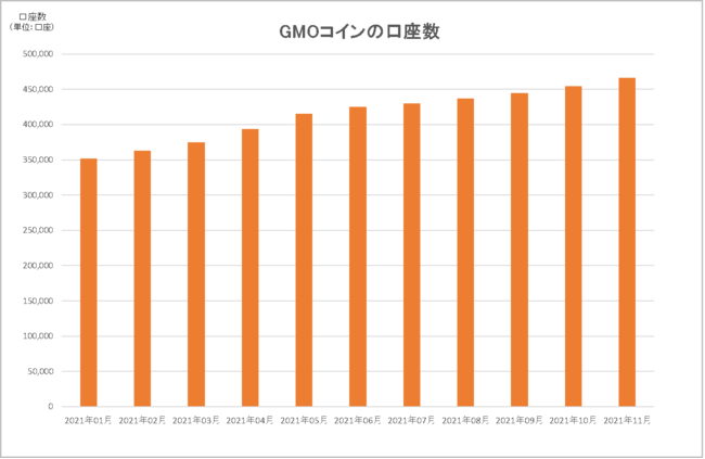 GMOコインの口座数は堅調に推移し、11月末時点で46万口座を突破。2021年の1年間では新規で約12万口座が開設されました。