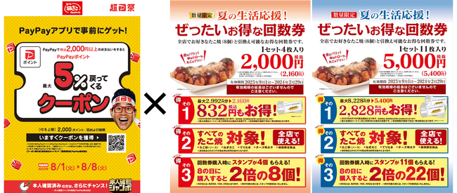 今年7月も数量限定で販売した “ぜったいお得な” 『夏の回数券』 は、ご好評をいただき完売店舗が続出し、再販のご要望も多くいただいたことから、このたび8月の追加発売が決定いたしました! 今回も 「お好きなたこ焼(8個入り)」(※1) と引換え可能な回数券が4枚(2,000円税抜 / 2,160円税込)と、11枚(5,000円税抜 / 5,400円税込)の2種をご用意!