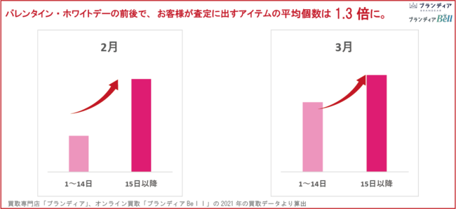 2021年の店舗買取、オンライン買取に特徴的な傾向として、ギフトシーズンである2月のバレンタインデー、3月のホワイトデーの前後では、特にアクセサリー類に関して、お客様が査定に出される商品の個数が、1.3倍増加していることがあげられます。