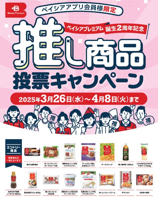 株式会社ベイシア(本社:群馬県前橋市、代表取締役社長:相木孝仁)は、プライベートブランド(以下PB)「Beisia Premium(ベイシアプレミアム)」が、2023年3月の発売開始から2周年を迎えたことを記念して、「ベイシアプレミアム誕生2周年記念 推し商品投票キャンペーン」を3月26日(水)より開始いたします。本キャンペーンはベイシアアプリ会員のお客様を対象に、約150アイテムの「Beisia Premium」全商品の中から推し商品に投票いただく企画です。日頃ご愛顧いただいている皆様への感謝の気持ちを込めて、ご投票いただいたお客様の中から抽選で500名様にベイシアポイント1,000ポイントをプレゼントいたします。さらに、店頭では「Beisia Premium」の特設売場を展開するほか、先行して実施している当社「目利き」従業員の投票と合わせた開票結果を後日発表し、店頭媒体なども掲示します。お客様・従業員一体となって「Beisia Premium」2周年を盛り上げてまいります。