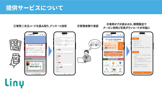 アンケート回答後、管理者側での照合が完了した参加者に対し、式典当日の写真をLINEで配信。あわせて、町内の商業施設や温泉施設で利用可能な期間限定クーポンを提供します。利用者はLINE画面を提示するだけでスムーズに利用でき、町内外の若者が伊方町の魅力を再発見する機会を創出します。