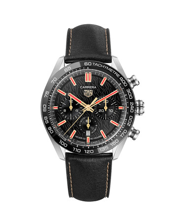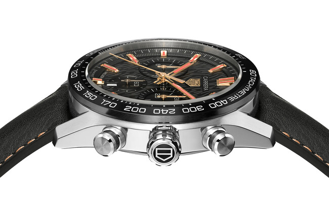 直径44mmのタグ・ホイヤー カレラ クロノグラフをベースにしたこの限定モデルは、エレガントなステンレススティールケース、レーシングの起源に由来するタキメータースケールを備えたディープブラックの固定式セラミックベゼル、カスタムデザインのダイヤルを備えています。
