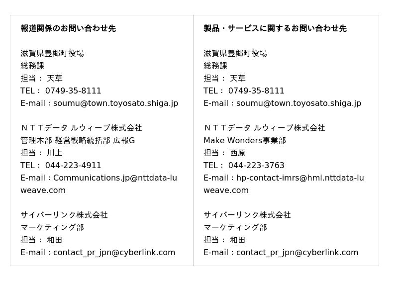 ※本ニュースリリースは、豊郷町役場、NTTデータ ルウィーブ、サイバーリンクが共同で配信しています。重複して配信されることがありますが、ご了承願います。