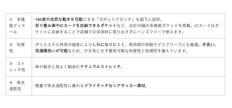 「グラミチ」のパンツに設計された特徴的なディテールである、180度の自然な動きを可能にした「ガゼットクロッチ」をジャケットにも設計。さらに、「マッキントッシュ フィロソフィー」の折り畳み傘「バーブレラ」を収納できるポケットや、袖にICカードを収納しハンズフリーで使用できるポケットなど、合計10個の多機能ポケットを搭載しました。