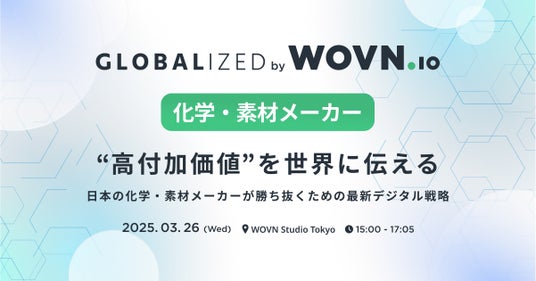 Web サイト多言語化ソリューション『WOVN.io(ウォーブン・ドットアイオー)』を提供する Wovn Technologies株式会社(本社:東京都港区、代表取締役社長:林 鷹治、以下 WOVN)は、2025年3月26日(水)15時から、GLOBALIZED 『“高付加価値”を世界に伝える ~日本の化学・素材メーカーが勝ち抜くための最新デジタル戦略~』を無料開催いたします。