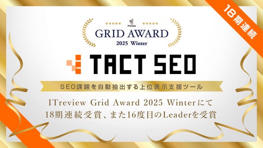 株式会社ウィルゲート(本社:東京都港区、代表取締役:小島 梨揮、以下「ウィルゲート」)が提供するAI×SEOツール「TACT SEO」は、アイティクラウド株式会社(本社:東京都港区、代表取締役社長 兼 CEO:黒野 源太)が主催する「ITreview Grid Award 2026 Spring」の「SEOツール」部門において、認知度とユーザー満足度が優れているサービスに贈られる「Leader」を受賞したことをお知らせいたします。今回でSEOツール部門は23期連続受賞、「Leader」の受賞は21度目(※1)となります。