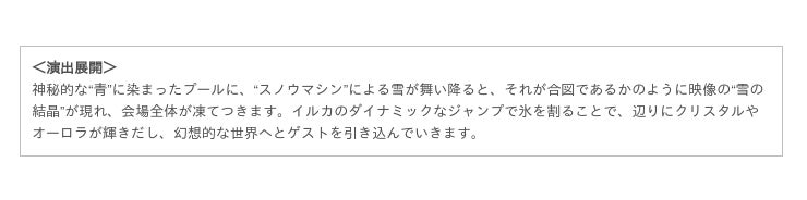 クリスタルやオーロラが会場全体をつつみ込み、“スノウマシン”による雪降る演出の中、イルカとトレーナーが魅せる静かなダンスパフォーマンスや、跳ねあがる水しぶきさえもが美しい、力強い全頭ジャンプなど、華麗な技の数々を披露します。