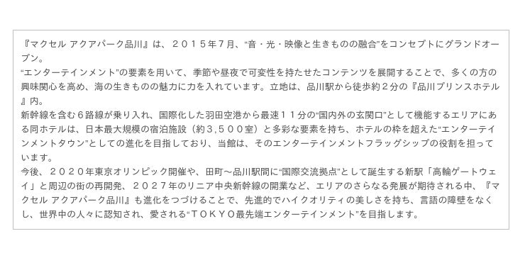 『マクセル アクアパーク品川』は、品川駅から徒歩約2分の『品川プリンスホテル』内に位置する都市型水族館です。