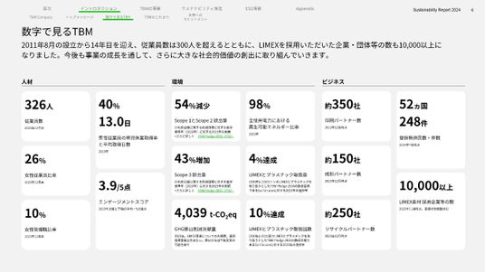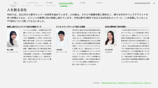 TBMでは、人づくりを経営の重要課題として捉えています。「Sustainability Report 2024」では、多様な価値観やバックグラウンドを持つメンバーが年齢や役職に関係なく、「サステナビリティ革命」の実現に向けて挑戦する様子をお伝えしています。