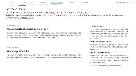「Sustainability Report 2024」には、マテリアリティに関する具体的な取り組みやTBMの2030年に向けた野心的な目標である、TBM Pledge 2030に対する進捗状況も掲載しています。