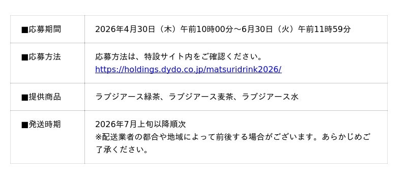 ▶特設サイトURL:https://holdings.dydo.co.jp/matsuridrink2026/