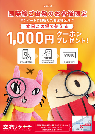 本アンケートは、国際線の需要動向を把握するとともに、より快適なサービス提供を目的として実施するものです。アンケートの回答には第1ターミナルの国際線出発ロビーに掲出しているポスター内QRコードをスマートフォン等で読み取り、アンケートページへアクセスする必要があります。回答所要時間は約3分、アンケート回答後には1,000円クーポンが発行され、第1ターミナル免税店等の対象12店舗でクーポンを利用することができます。