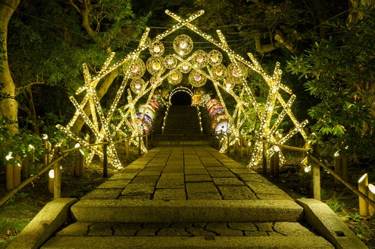 ~HANA・BIYORI × 竹あかり~」を開催しています。優美にライトアップされた樹木や花々、文化財、竹に穴をあけて明かりを灯す約 1,000 本の竹あかりなど、やわらかな光に包まれるライティングイベントです。ジュエルミネーションとは一味違う和のイルミネーションで、優雅なひと時をお過ごしください。